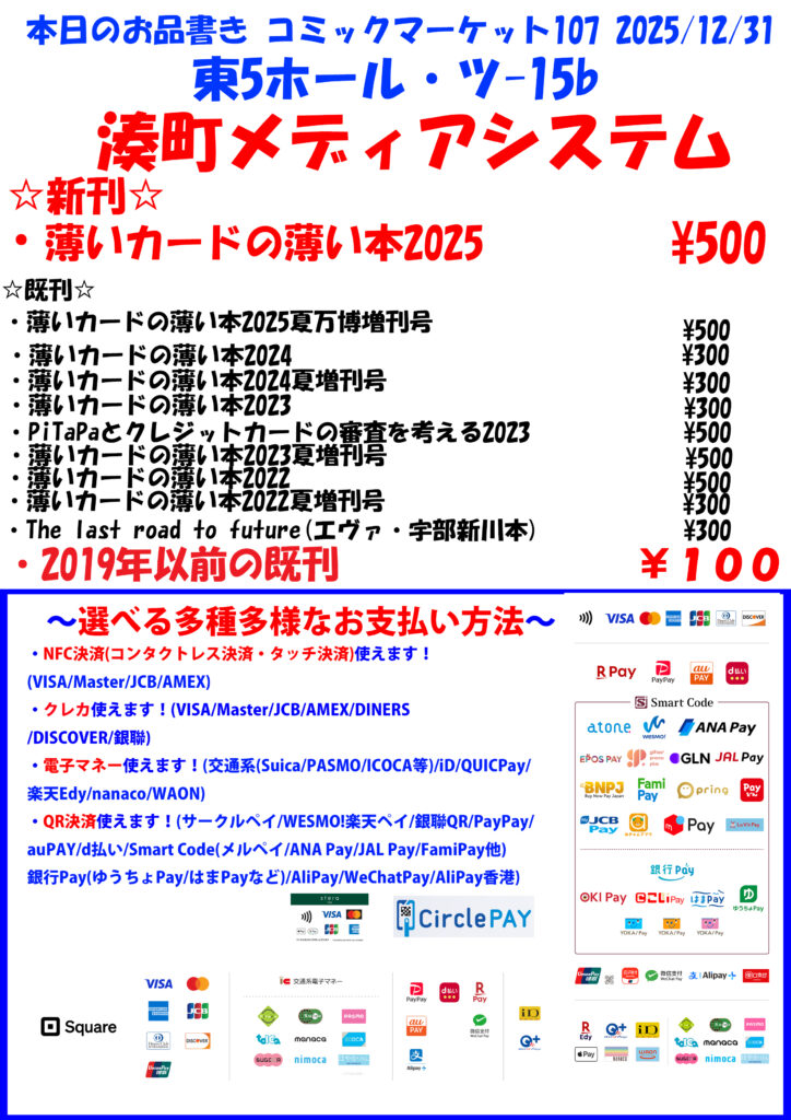C107お品書き・決済方法一覧 イベント参加 Twitter Facebook はてブ Pocket LINE コピー 2025.12.30 C107お品書き・決済方法一覧です。 12/31東5ホール・ツ-15b「湊町メディアシステム」でお待ちしております。